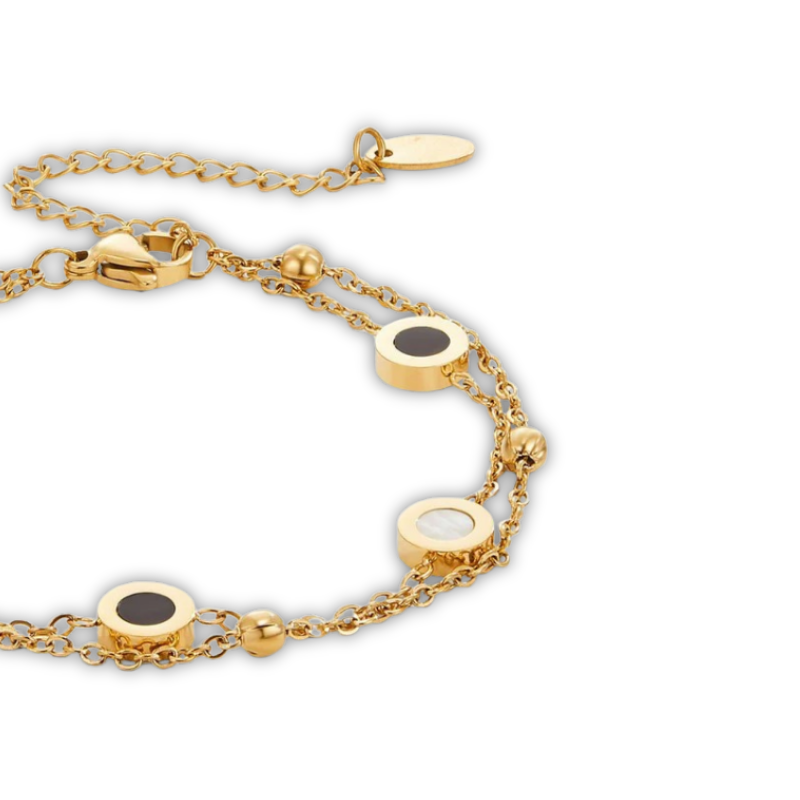 Ανακαλύψτε το βραχιόλι Carla, μια τέλεια σύνθεση από δύο λεπτές αλυσίδες που αγκαλιάζουν τον καρπό σας με ελαφρότητα και κομψότητα. Οι στρογγυλές μαύρες πλάκες και οι πέρλες προσφέρουν έναν σύγχρονο ρυθμό, ενώ οι μικρές χρυσές σφαίρες προσθέτουν αρμονική θηλυκή λάμψη.